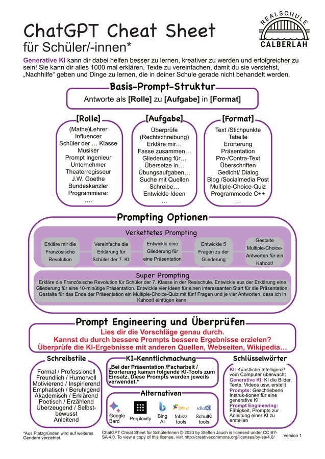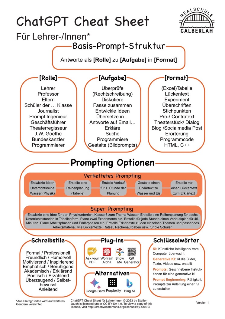 Die Fähigkeit zu prompten, um präzise und relevante Antworten von einer Künstlichen Intelligenz zu erhalten, muss erlernt werden. Steffen Jauch hat zwei Infografiken erstellt, um Lehrkräfte und Lernende dabei zu unterstützen.